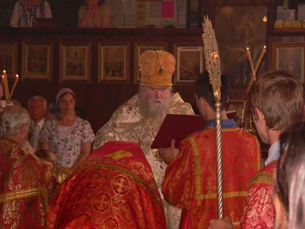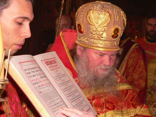 На входе с Евангелием, в соответствии с решением ВВЦУ, епископ Агафангел возвел игумена Андроника (Котлярова) в сан архимандрита с возложением митры.